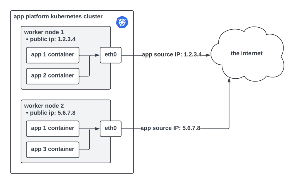 App Platform runs atop Kubernetes, which means Kubernetes handles the scheduling and management of apps across a large pool of worker nodes. Each worker node in a cluster is assigned its own public IPv4 address. Having a public IP address means the workers can connect to the internet and talk to other internet-connected devices. We call this network traffic “egress traffic” because it leaves the data center hosting an app. When an app is deployed on App Platform, Kubernetes decides where to place that app’s container(s) within the worker pool. Without the dedicated egress feature enabled, the source IP of egress app traffic is the public IP address of the Kubernetes worker running that app instance, shown below.